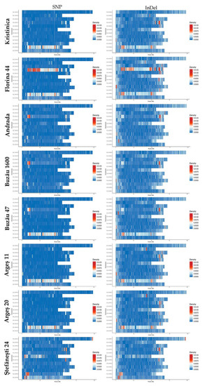 For the eight studied genotypes, the SNP and InDel densities on each chromosome were similar (Figure 4) and varied as follows. For the genotype Kristinica, the highest density was noted in chromosome 11, followed by chromosome 4. InDel density was also noted in chromosomes 2, 5, and 9.