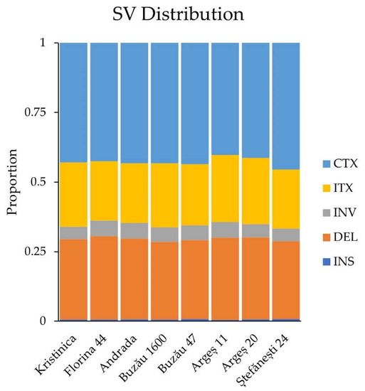 The SVs were distributed in all regions of the genomes: upstream, exonic, downstream, intronic, upstream/downstream, splicing, intergenic, and others (Supplementary Table S4). A visual representation of these data is visible in Supplementary Figure S3. The highest number of SVs was observed in the intergenic regions (between 1623 in Argeș 20 and 2663 in Andrada), followed by the exonic (between 446 in Argeș 20 and 817 in Florina 44), intronic (between 96 in Buzău 47 and 169 in Andrada), upstream (between 55 in Buzău 47 and 109 in Andrada), downstream (between 32 in Argeș 20 and 74 in Andrada), upstream/downstream (between 6 in Buzău 1600 and 11 in Florina 44), and splicing (between none in Buzău 1600 and Argeș 11 and 3 in Argeș 20) regions. The distribution of the five types of SVs is visible in Figure 5.