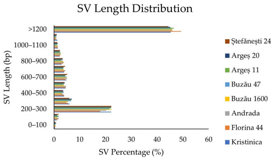 The highest percentage of SVs was interchromosomal translocations, followed by the deletions, intrachromosomal translocations, inversions, and insertions. More than 40% of SVs were longer than 1200 bp. Approximately 20% of the SVs had a length of 200–300 bp. For the rest of the SVs’ length-size categories, the percentages were lower than 7%. The rarest SVs were those with a length of less than 100 bp (~0.4–0.7%) (Figure 6).
