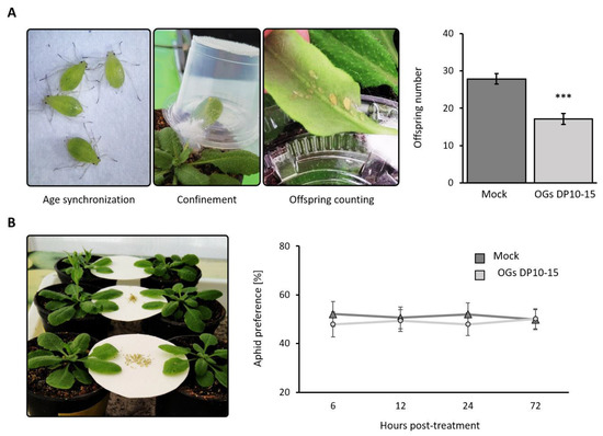 Treatment with OGs decreases the number of aphid offspring. (A) A no-choice assay was performed to determine the effect of OG treatment on the number of offspring deposited by Myzus persicae aphids. Fully expanded leaves of 4-week-old Arabidopsis plants were infiltrated with OGs having a degree of polymerization of 10–15 (DP 10–15) (200 µg mL−1) or ultrapure water (mock). One-day-old nymphs were confined to the treated leaves, and 12 days after treatment, the offspring were counted. Error bars correspond to standard error. Asterisks represent significant differences determined using Student’s t-test (***, p < 0.001; n = 6). (B) A free-choice assay was executed to determine the settling preference of M. persicae. Fully expanded leaves of 4-week-old Arabidopsis plants were infiltrated with OGs (DP 10–15; 200 µg mL−1) or ultrapure water (mock). Subsequently, 30 adult wingless aphids were placed between the treated leaves to freely choose their preferred host at different post-treatment temporalities. The Student’s t-test was used for comparing means. The error bars correspond to standard error. No significant differences were found at any of the temporalities assayed (p > 0.05; n = 10).