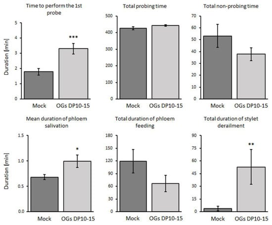 Treatment with OGs negatively alters the feeding performance of aphids. The feeding profiles of M. persicae aphids, on either OG- or mock-treated plants, were analyzed using electrical penetration graph (EPG) assays. Fully expanded leaves of 4-week-old Arabidopsis plants were infiltrated with OGs (DP 10–15; 200 µg mL−1) or ultrapure water (mock). One adult wingless aphid was placed over the treated leaves, and its feeding profile was recorded using EPG for 8 h. Only data from the 72 hpt timepoint are shown, as the main differences were found at this temporality. The results obtained at 6, 12, and 24 hpt are presented in Supplementary Table S1. Significant differences, indicated by asterisks, were determined using the Student’s t-test or the Mann–Whitney U test, depending on the data distribution of each feeding parameter (i.e., Gaussian or non-Gaussian, determined using the Shapiro–Wilk test). The error bars correspond to standard error. At least 15 independent replicates were assayed for each condition (*, p < 0.05; **, p < 0.005; ***, p < 0.001).