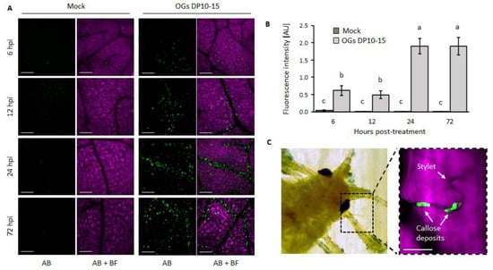 Callose synthesis is a common plant defense mechanism against aphids [,]. Indeed, we consistently found callose deposition surrounding the stylets of M. persicae that infested Arabidopsis (Figure 3C and Figure S1). Considering that OGs elicit the deposition of callose [], we hypothesized that this could contribute to the decreased feeding performance of aphids on OG-treated plants (Figure 1 and Figure 2). Thus, we evaluated the kinetics of callose deposition after OG treatment at the same temporalities at which EPGs were performed. OGs with DP 10–15 more efficiently elicited callose accumulation than those with DP 3 and DP 25–50 (Figure S2). They also significantly induced substantial amounts of callose deposition in Arabidopsis leaves compared with that observed in mock-treated plants at all timepoints (Figure 3A,B, Figures S3–S6). Callose accumulation was higher at the later timepoints (24 and 72 hpt) than at the earlier ones (6 and 12 hpt; Figure 3A,B).