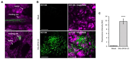 The accumulation of ROS upon aphid infestation in plants has been previously reported [,], and in Arabidopsis, it can be elicited by OG treatment, where it peaks at early temporalities (6–8 hpt) [,]. In our study, intracellular ROS accumulated locally, close to the feeding site of M. persicae both in the vascular bundle and mesophyll, 6 h post-infestation (Figure 4A and Figure S7). The intracellular ROS at 6 hpt, induced by OG treatment, was not detected in mock-treated leaves (Figure 4B,C and Figure S8).