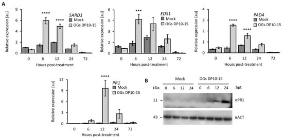 Treatment with OGs increases the expression of salicylic acid (SA)-related genes. (A) The transcriptional profile of SA-related genes in fully expanded leaves of 4-week-old Arabidopsis plants, treated with OGs (DP 10–15; 200 µg mL−1), at different post-treatment temporalities. Results are expressed as the relative expression in arbitrary units (au). The error bars represent standard error. Asterisks represent significant differences between mock- and OG-treated samples at the same temporalities as determined using the Student’s t-test (***, p < 0.001; ****, p < 0.0001; n = 4). (B) PR1 protein levels in mock- and OG-treated Arabidopsis leaves at different post-treatment temporalities analyzed using Western blot.