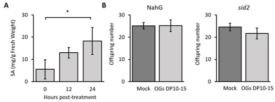 OG-induced resistance against aphids requires SA accumulation. (A) SA content measured in Arabidopsis leaves treated with OGs (DP 10–15) at 0, 12, and 24 hpt (n = 3). Asterisk represents significant differences found using Student’s t-tests (*, p < 0.05). (B) No-choice assay performed with NahG and sid2 Arabidopsis genotypes deficient in SA accumulation. Fully expanded leaves of 4-week-old Arabidopsis plants were infiltrated with OGs (DP 10–15; 200 µg mL−1) or ultrapure water (mock). One-day-old nymphs were confined to treated leaves of both NahG and sid2 plants, and 12 days after treatment, the number of offspring was counted. Using Student’s t-test, no significant differences were found between the number of offspring deposited by aphids on mock- and OG-treated NahG and sid2 plants. At least six replicates were assayed for each condition.