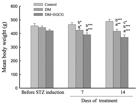 Body weight changes. The data were expressed as mean ± SEM. *, p < 0.05; **, p < 0.01; ***, p < 0.001. (a), compared to the control group at the same time point (7 days or 14 days); (b), compared to the same group before STZ injection; (c), compared to the DM group at the same time point. DM, diabetes mellitus; EGCG, epigallocatechin gallate; STZ, streptozotocin.