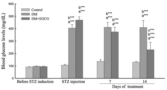 Blood glucose levels. The data were expressed as mean ± SEM. ***, p < 0.001. (a), compared to the control group at the same time point (7 days or 14 days); (b), compared to the same group before STZ injection; (c), compared to the DM group at the same time point. DM, diabetes mellitus; EGCG, epigallocatechin gallate; STZ, streptozotocin.