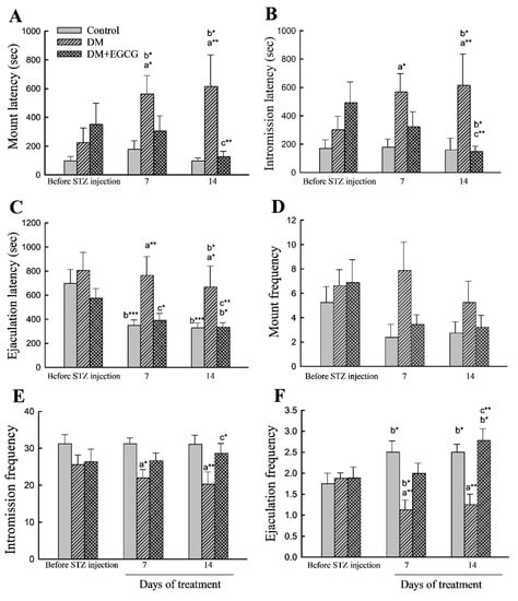 Sexual behavior parameters. (A) mount latency; (B) intromission latency; (C) ejaculation latency; (D) mount frequency; (E) intromission frequency; (F) ejaculation frequency. The data were expressed as mean ± SEM. *, p < 0.05; **, p < 0.01; ***, p < 0.001. (a), compared to the control group at the same time point (7 days or 14 days); (b), compared to the same group before STZ injection; (c), compared to the DM group at the same time point. DM, diabetes mellitus; EGCG, epigallocatechin gallate.