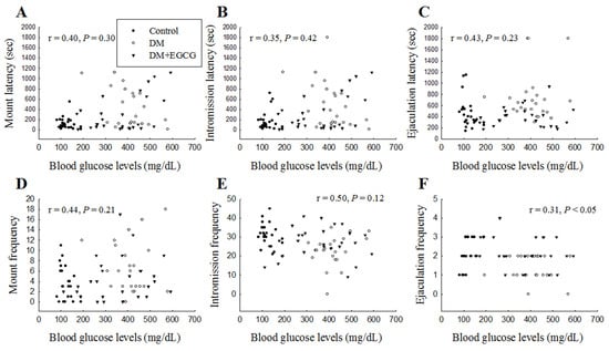 When plotting the sexual behavior parameters (ML, IL, EL, MF, IF, and EF) against the fasting blood glucose levels for three groups (the vehicle-treated control group, vehicle-treated diabetic group, and EGCG-treated diabetic group), Figure 4F showed there was a significant correlation only between EF and blood glucose levels (r = 0.31, p < 0.05) (Figure 4).
