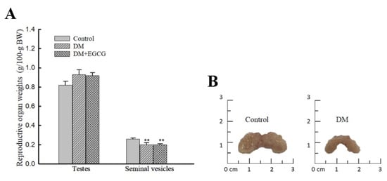 Weights of testes and seminal vesicles (A) and photographs of the seminal vesicles of representative control and diabetic rats (B). The organ weights are expressed as g/100 g body weight. ** p < 0.01 vs. control group. DM, diabetes mellitus; EGCG, epigallocatechin gallate.