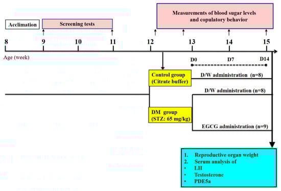 One week after screening, the rats were tested for sexual behavior before STZ injection. Then, the rats were randomly divided into three groups: vehicle-treated control group (Control, n = 8), vehicle-treated diabetic group (DM, n = 8), and EGCG-treated diabetic group (DM + EGCG, n = 9).