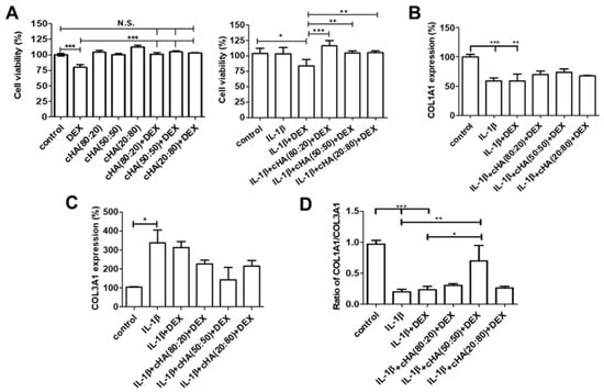 Effects of various combinations of cross-linked hyaluronate (cHA) with dexamethasone (DEX) in cell viability and interleukin-1 (IL)-1β-stimulated gene expression. Human primary tenocytes were treated with different formulations of cHA (cHA:linearized HA = 80:20, or 50:50, or 20:80, at the concentration of 2.5 mg/mL), DEX (100 μM), and combinations of cHA with DEX (100 μM) in response to IL-1β (1 ng/mL) stimulation. (A) Cell viability was determined by WST-8 analysis. Data were represented as the percentages normalized with the average WST-8 values read at an absorbance of 450 nm of the control group and expressed as mean ± SEM. Relative expression of (B) COL1A1 (C) COL3A1 was determined by quantitative reverse transcription polymerase chain reaction (qRT-PCR). (D) The ratio of COL1A1/COL3A1 was shown among each group. Values are the mean ± SEM (n = 3–8). * p < 0.05, ** p < 0.01, *** p < 0.001.