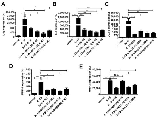 Effects of cHA with DEX in IL-1β-stimulated expressions of inflammatory mediators and matrix metalloproteinases (MMPs). Human primary tenocytes were treated with different formulations of cHA (cHA:linearized HA = 80:20, or 50:50, or 20:80, at the concentration of 2.5 mg/mL), DEX (100 μM), and combinations of cHA with DEX (100 μM) in response to IL-1β (1 ng/mL) stimulation. Relative expressions of (A) IL-1β (B) IL-6 (C) cyclooxygenase-2 (COX-2) (D) matrix proteinase-1 (MMP)-1, and (E) MMP-3 were determined by quantitative reverse transcription polymerase chain reaction (qRT-PCR). Values are the mean ± SEM (n = 2–3). * p < 0.05, ** p < 0.01, *** p < 0.001.