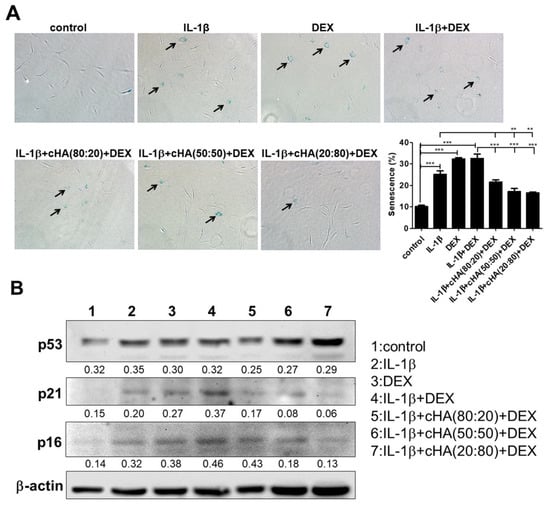 Effects of cHA with DEX in cellular senescence. Human primary tenocytes were treated with different formulations of cHA (cHA:linearized HA = 80:20, or 50:50, or 20:80, at the concentration of 2.5 mg/mL), DEX (100 μM), and combinations of cHA with DEX (100 μM) in response to IL-1β (1 ng/mL) stimulation. (A) Senescence β-galactosidase (SA β-gal) staining showed positive cells in IL-1β, DEX-, combinations of cHA with DEX-treated tenocytes. Arrows indicate SA β-gal-positive cells. (B) Immunoblotting for p53, p21, and p16 expressions in the three formulations of cHA with DEX. Values are the mean ± SEM (n = 3). ** p < 0.01, *** p < 0.001.
