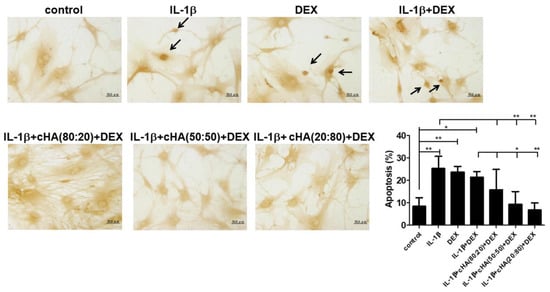 Effect of cHA and DEX in apoptosis. Human primary tenocytes were treated with different formulations of cHA (cHA:linearized HA = 80:20, or 50:50, or 20:80, at the concentration of 2.5 mg/mL), DEX (100 μM), and combinations of cHA with DEX (100 μM) in response to IL-1β (1 ng/mL) stimulation. Terminal deoxynucleotidyl transferase dUTP nick end labeling (TUNEL) staining showed positive cells in IL-1β, DEX-, combinations of cHA with DEX-treated tenocytes. Arrows indicate TUNEL-positive cells. Values are the mean ± SEM (n = 3–5). * p < 0.05, ** p < 0.01.
