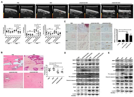 Excessive apoptosis has been reported as a primary cause of tendinopathy [] and found in tendinopathic rotator cuff [,], patellar tendons [], and Achilles tendons []. Apoptotic phenotype is also positively correlated with the severity of tendinopathy [,]. The modulation of apoptosis via various approaches has shown therapeutic potential in experimental tendinopathy [,]. In our results, excessive apoptosis following IL-1β, DEX, and IL-1β + DEX inductions in primary human tenocytes can be reversed by cHA (50:50) + DEX and cHA (20:80) + DEX (Figure 4). In the experimental rat tendinopathy model, the ratios of TUNEL-positive cells in both the cHA + DEX groups were significantly decreased compared with PBS or DEX groups (Figure 6). Furthermore, in both the cHA + DEX groups, the ratios of Bcl-2/Bax were higher and correspondingly the levels of cleaved caspase-3 were lower (Figure 5D). Therefore, the reduction in excessive apoptosis might be one of the therapeutic mechanisms by the cHA + DEX treatment. Accordingly, the therapeutic effects improved the US features including hypoechogenicity and neovascularization, the two common parameters in clinical US assessment for tendinopathy [].