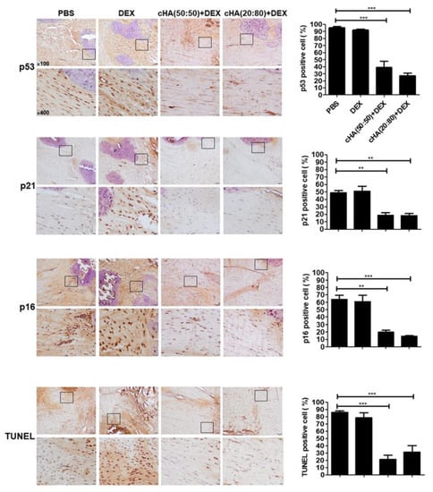 Immunohistochemistry of senescence-related markers and TUNEL analysis in the experimental rat model. Eight weeks after the intratendinous collagenase injection, the rats were scarified for further analysis. Immunohistochemical stainings and quantitative analysis of p53, p21, p16, and TUNEL were performed in the patellar tendons treated with PBS, DEX, cHA (50:50) + DEX, and cHA (20:80) + DEX. Bars shown at ×100 and ×400 magnifications correspond to 50 and 20 μM. Values are the mean ± SEM. ** p < 0.01, *** p < 0.001.