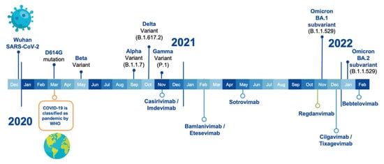 Figure 1 shows the timeline of VOCs emergence and EUA of the therapeutic antibodies. Five SARS-CoV-2 VOCs have been declared by the Centers for Disease Control and Prevention (CDC), the European Centre for Disease Prevention and Control (ECDC), and the WHO. The Alpha variant (B.1.1.7 lineage) was reported in September 2020 in the UK and presented eight mutations in the S protein: H69-V70 deletions, Y144 deletion, N501Y, A570D, P681H, T716I, S982A, and D1118H [26]. Interestingly, the Beta variant (B.1.35 lineage) was reported earlier than Alpha, in May 2020 in South Africa. It has nine mutations: L18F, D80A, D215G, R246I, K417N, E484K, N501Y, A701V, and the 242–244 deletion [27]. The third VOC, Gamma variant-P.1 lineage, was first reported in November 2020 in Brazil, showing ten mutations: L18F, T20N, P26S, A138Y, R190S, K417T, E484K, N501Y, H655Y, and T1027Y [28]. The Delta variant (B.1.617.2 lineage), reported in October 2020 in India, has amino acid substitutions at T19R, G142D, L452R, T478K, P681R, and D950N, and deletions in positions 157 and 158 [29].