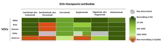 Neutralization potency of the EUA-approved anti-COVID-19 antibodies when challenged with SARS-CoV-2 VOCs. The heat map is based on the neutralization values of pseudovirus assays against SARS-CoV-2 variants [42,43,44,45]. The values of NC50 in ng/mL are depicted in the following color code: <20 (dark green), 21–100 (hunter green), 101–1000 (lime green), 1001–9999 (light green), >10,000 (orange).