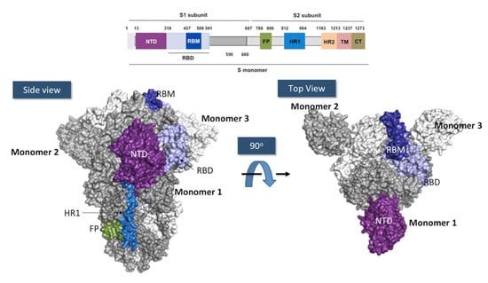 Each S monomer is made of around 1300 amino acids and is composed of two subunits: S1 and S2. S1 (residues 1–680) recognizes the hACE-2, whereas S2 (residues 681–1300) facilitates the virus fusion to the cell membrane [56]. S1 subunit contains the N-terminal domain (NTD; residues 13–319) and the receptor-binding domain (RBD; residues 319–541). The RBD includes the receptor binding motif (RBM; residues 437–508), which is directly involved in hACE-2-specific binding. S2 consists of the fusion peptide (FP; residues 788–806), two heptapeptide repeat sequences 1 and 2 (HR1 and HR2), a transmembrane domain (TM; residues 1213–1237), and a cytoplasm domain (CT; residues 1237–1273) [57].