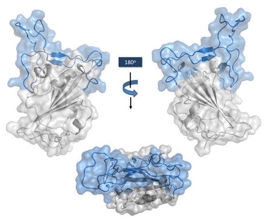 Connolly surface of the RBD with RBM motif in light blue. Side views on the top. RBM seen from the hACE-2 perspective on the bottom. The figure was generated using the coordinates with PDB ID: 7MZG in PyMOL Molecular Graphics System version 2.4.1. Schrödinger, LLC, New York (https://pymol.org/2, accessed on 16 May 2022).