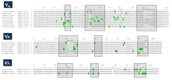Sequence alignment of the therapeutic antibodies. The second column corresponds to the name of the IGHV, IGKV, or IGLV germline genes. The third column is the number of putative somatic mutations, indicated in green squares in the sequences. The germline genes were assigned using Ig BLAST (https://www.ncbi.nlm.nih.gov/igblast/ accessed on 16 May 2022). The CDRs are indicated in gray squares as defined using Kabat’s numbering convention.