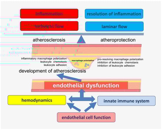 The data obtained in recent years have significantly expanded the understanding of the functions of endothelial cells, which allows them to be considered as a key participant of vascular biology. Many of these functions are closely related to each other and have complex pathways of regulation. Endothelial dysfunction associated with impaired nitric oxide (NO) bioavailability is considered to be one of the key links in the early history of atherogenesis. In addition, inflammation in the vascular wall, which is associated with an imbalance in the production of lipid mediators involved in the activation and resolution of inflammation, is another key step determining the rate of progression of atherosclerosis []. In addition, local changes in vascular hemodynamics, such as turbulent blood flow, may be related to the localization of atherosclerotic lesions. A growing body of evidence supports the idea that these chains of pathogenesis are closely linked (Figure 1), but the keys to understanding many of these connections are still not available to researchers and clinicians.