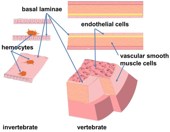 It is known that most of the invertebrates, which make up the majority of biodiversity today, lack the vascular endothelial lining []. However, in some of them, such as cephalopods, annelids, and amphioxus, the vascular wall has cells clinging to the lumen surface [,,,,,]. These cells are shaped like amebocytes and do not form a continuous layer. They are not connected by the intercellular junctions typical of vertebrate endothelial cells and rarely appear attached to the basal lamina [,]. It is suggested that the transition between amebocytes and endothelium involved the acquisition of an epithelial phenotype, and immunological cooperation is seen as an early function of these protoendothelial cells []. The model of blood system transition from invertebrates to vertebrates suggests the origin of true endothelial cells from circulating (blood-like) cell progenitors (Figure 2) []. Thus, maintenance of blood pressure and immune function have some common connections. Although the circulatory and immune systems of invertebrates and vertebrates have profound differences, some evolutionarily conserved mechanisms underlying the cross-linkages of hemodynamic and immune regulation are of interest.