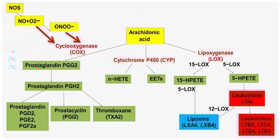 Arachidonic acid metabolic pathways and NO crosslinks. Abbreviations: EETs—epoxyeicosatrienoic acids; HETE—hydroxyicosatetraenoic acid; NOS—nitric oxide synthase; 5−HPETE—5−hydroperoxyeicosatetraenoic acid; 15−HPETE—15−hydroperoxyeicosatetraenoic acid; 5−LOX—5−lipoxygenase; 12−LOX—12−lipoxygenase; 15−LOX—15−lipoxygenase.