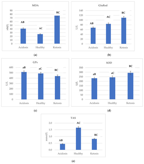 Differences in the activity of (a) MDA, (b) GluRed, (c) GPx, (d) SOD and (e) TAS depending on the health status of cows. Data were presented as least squares means with a standard error of the mean. Means marked with the same letters differ significantly at lowercase letters, p ≤ 0.05; uppercase letters, p ≤ 0.01. MDA, malondialdehyde; GluRed, glutathione reductase; GPx, glutathione peroxidase; SOD, superoxide dismutase; TAS, total antioxidant status; BHBA, β-hydroxybutyric acid.
