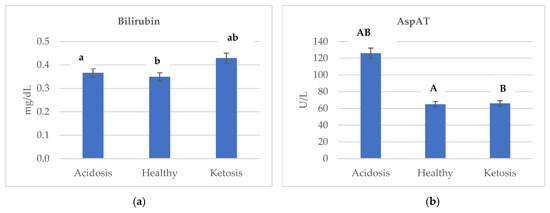Changes in the concentration of (a) bilirubin, (b) AspAT, (c) glucose, (d) protein, (e) albumin, (f) creatine, and (g) GGTP depending on the health status of cows. Data were presented as least squares means with a standard error of the mean. Means marked with the same letters differ significantly at lowercase letters, p ≤ 0.05; uppercase letters, p ≤ 0.01. AspAT, aspartate aminotransferase; GGTP, gamma-glutamyltranspeptidase.