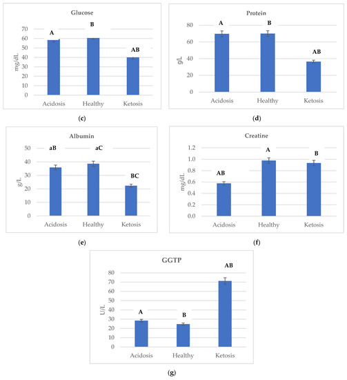 Figure 2 shows the changes in concentration of (a) bilirubin, (b) AspAT, (c) glucose, (d) protein, (e) albumin, (f) creatine, and (g) GGTP depending on the health status of cows. Ketotic cows were characterized by the highest level of bilirubin and GGTP. The lowest GGTP activity in healthy cows was reported as 24.686 U/L, while the highest in ketotic was 71.175 U/L (Figure 2g). Additionally, in comparing ketotic and acidotic cows, the concentration of bilirubin was higher by a factor of almost 1.17 (Figure 2a).