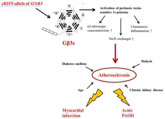 The GNB3 gene is one of the five genes that encode for the β-subunits of G-proteins. The c.825C>T polymorphism is a widely studied polymorphism of GNB3 which causes an in-frame deletion of 123 nucleotides within exon 9 of the GNB3 gene []. The in-frame deletion leads to alternative splicing of the GNB3 gene, and this splicing is associated with the production of a truncated Gβ3 molecule (Gβ3s) that lacks 41 amino acids, a characteristic resulting in an alteration of the three-dimensional structure of the β-subunit []. Thus, subjects carrying the T-allele express both the truncated Gβ3s and wild-type Gβ3, and thereby exhibit a gain of function and subsequent enhanced activation of G-protein-induced signaling pathways []. The generation of Gβ3s related to the GNB3 c.825C>T polymorphism has been linked to increased signal transduction via the G-protein-coupled receptors in diverse human cells, such as B and T lymphocytes, neutrophils, and fat cells [,,,]. The novel Gβ3s protein differs from Gβ3, but it exhibits functional activity and causes enhanced activation of pertussis toxin-sensitive G-proteins in 825T-allele carriers []. Increased binding of GTPγS to permeabilized Sf9 insect cells was detected in cells expressing the Gβ3s protein []. Vasoconstrictive hormones such as norepinephrine and angiotensin II are predominantly using and activating the pertussis toxin-sensitive G-protein heterotrimers. The pertussis toxin-sensitive G-proteins are involved in α2-adrenergic coronary vasoconstriction. Thus, in in vitro studies of α2-adrenoceptor mediated coronary vasoconstriction was enhanced in cells derived from 825T-allele carriers expressing the Gβ3s []. Moreover, an augmentation of chemotaxis potential of neutrophils which is mediated via β/γ-subunits released from pertussis toxin-sensitive Gα-subunits, was found in 825T-allele carriers. Stimulation with interleukin-8 which activates the CXC receptor coupled to the pertussis toxin-sensitive G-protein resulted in the increased chemotactic response of neutrophils obtained from individuals exhibiting the Gβ3s protein []. COS-7 cells transfected with the Gβ3s protein also revealed increased the chemotaxis activity compared to the cells following transfection with the wild-type Gβ3 [].