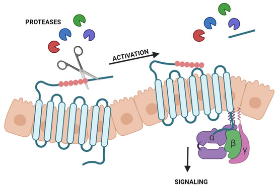 - Ossovskaya, V.S.; Bunnett, N.W. Protease-Activated Receptors: Contribution to Physiology and Disease. Physiol. Rev. 2004, 84, 579–621. [Google Scholar] [CrossRef]