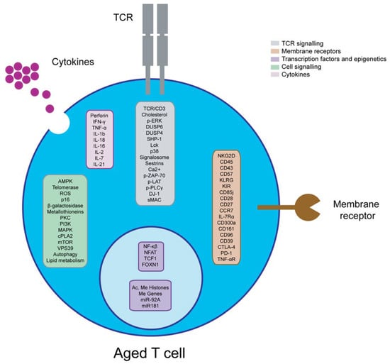 Schematic representation of altered molecules in senescent T cells. During T cell senescence, multiple molecules are altered, among them molecules related to TCR signalling (grey), cell signalling (green), epigenetics and transcription factors (purple), membrane receptors (brown) and cytokines (pink).