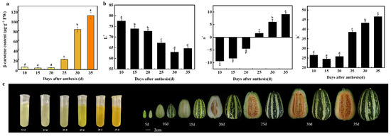 According to target metabolome analysis in a previous study, β-carotene is a major carotenoid metabolite in oriental melon, making the flesh of the ‘HDB’ fruit appear orange [33]. The results measured by HPLC showed that the β-carotene content of fruit was less than 10 μg·g−1 FW at the young fruit stage (from 10 to 20 days after anthesis, DAA), and the β-carotene content increased sharply at the mature stage from 21 μg·g−1 FW to 110 μg·g−1 FW (from 25 to 35 DAA) (Figure 1a). The L* value (negative-positive) represented from darkness to brightness, a* value (negative-positive) indicated from green to red, and b* value (negative-positive) showed from blue to yellow. The L* value sharply declined, and a* value and b* rapidly increased at the mature fruit stage (Figure 1b). The variation of these values was consistent with that of β-carotene content (Figure 1c), and these data indicated that 25 DAA is an essential point of flesh color change.
