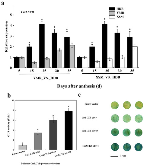 The 5′-upstream promoter sequence (1474bp) of CmLCYB was obtained using PCR amplification, and the PCR product was subcloned into a 19-T vector (Takara, Dalian, China). After sequencing, the true promoter of CmLCYB was selected and submitted to the PlantCARE (http://bioinformatics.psb.ugent.be/webtools/plantcare/html/) (accessed on 27 April 2022) and new PLACE (https://www.dna.affrc.go.jp/PLACE/?action=newplace) (accessed on 2 May 2022) database to predict the diverse cis-elements. For promoter activity analysis, we deleted different lengths from the 5′ region to produce three promoter fragments. These promoter fragments were fused to GUS by replacing the CaMV35S promoter in the PBI101-GUS vector, respectively, while the PBI101 empty vector was used as a negative control. Subsequently, these fusion plasmids were transferred into Agrobacterium tumefaciens strain EHA105 and cultured on a YEP plate at 28 °C for 48 h. The healthy tobacco (Nicotiana benthamiana) leaves were used for injection and grown in a chamber for three days to detect GUS activity. The GUS activity and histochemical staining in transiently expressed tobacco leaves were detected as described previously [43]. The infiltration assay was conducted with three biological replicates.