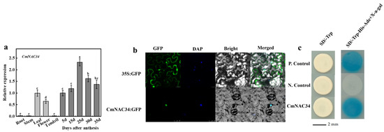 Additionally, we examined the subcellular localization of CmNAC34 through transient expression of CmNAC34 in tobacco leaves. We observed that the green fluorescent protein (GFP) signal of CmNAC34 overlapped with the signal of the nuclear maker, DAPI, which indicated that the CmNAC34 protein was localized in the nucleus. These results provided direct evidence that CmNAC34 encoded a nuclear protein and could serve as a TF regulate expression of its target gene (Figure 3b). To further confirm the transcriptional activity, the Y2H Gold yeast cell transformed with recombinant plasmid pGBKT7-CmNAC34 was cultured in SD/-Trp for 3–5 days and then transferred to SD/-Trp-His-Ade with X-α-gal medium. The result showed that all yeast cells grew well on SD/-Trp medium, but only positive control and pGBKT7-CmNAC34 yeast cells could survive and turn blue on SD/-Trp-His-Ade with X-α-gal medium, which proved the CmNAC34 possessed transcriptional activity (Figure 3c).