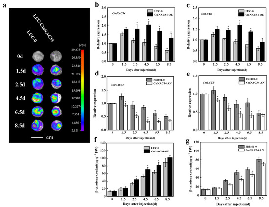CmNAC34 was transiently expressed in oriental melon and β-carotene concentration in transiently transgenic fruit. (a) The luciferase intensity was detected in LUC-0 and LUC-CmNAC34 fruit at different days after infiltration. (b,c) The relative expression of CmNAC34 and CmLCYB in oriental melon fruit overexpressed CmNAC34 and fruit infiltrated with LUC-0. (d,e) The relative expression of CmNAC34 and CmLCYB in oriental melon fruit silenced CmNAC34 and fruit infiltrated with PRI101. (f) The β-carotene concentration of transient overexpression of CmNAC34 and LUC-0 fruit were measured using HPLC. (g) The β-carotene concentration of transient silence of CmNAC34 and PRI101fruit were measured using HPLC. The data were analyzed from three biological replicates, and the error bar represents the SE. Asterisks indicate a significant difference compared to control, as determined by the independent sample t-test (* p < 0.05).