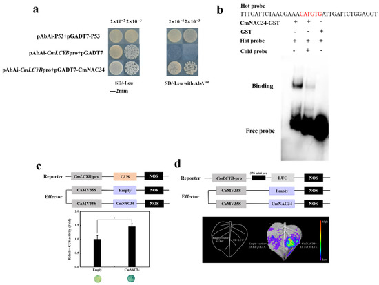 CmNAC34 activates the expression of CmLCYB by interaction with its promoter. (a) Y1H assay showed that CmNAC34 binds to the promoter of CmLCYB in the yeast system. SD/-Leu, SD medium deficient Leu; SD/Leu with AbA100, SD medium deficient Leu supplemented with 100 ng·mL−1 of AbA. The transformed yeast cells were dripped at 2 × 10−2 and 2 × 10−3 on the selective medium, respectively. (b) EMSA shows that the CmNAC34 binds to the CATGTG motif in the CmLCYB promoter. (c) Schematic diagram of reporter and effector constructs in GUS assay. The reporter and effector were co-infiltrated into tobacco leaves to analyze the regulation of GUS activity. (d) Schematic diagram of reporter and effector constructs in a luciferase reporter assay. The reporter and effector were co-infiltrated into tobacco leaves, and this assay showed CmNAC34 positively regulated CmLCYB expression. The colors represent the gene expression abundance. Three independent injected tobacco leaves were performed, and the error bar represents the SE. Asterisks indicate a significant difference compared to control, as determined by the independent sample t-test (* p < 0.05).