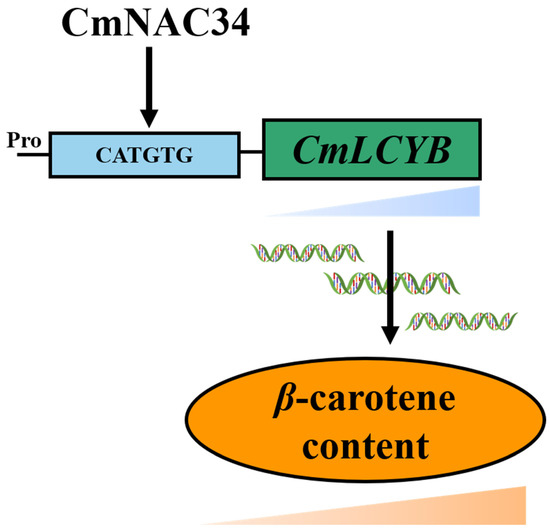 Because there are some difficulties in the genetic transformation system of oriental melon, we performed an Agrobacterium tumefaciens-mediated fruit infiltration assay to further verify that CmNAC34 affected CmLCYB-mediated carotenoid metabolism. The expression of CmNAC34 was gradually increased and then slightly decreased, peaking at 4.5 days after injection in CmNAC34-OE fruit, which corresponded to the changes in luciferase fluorescence intensity (Figure 4a). Additionally, the transcription level of CmNAC34 was consistent with CmLCYB not only in CmNAC34-OE fruit but in CmNAC34-AN fruit, which implied the CmNAC34 could regulate the expression of CmLCYB (Figure 4b–e). Then, the β-carotene content was significantly higher and lower in CmNAC34-OE fruit and CmNAC34-AN fruit, respectively (Figure 4f,g). The proposed working module is shown in Figure 6. It is worth noting that the expression of CmNAC34 and CmLCYB or β-carotene content only showed a significant difference in individual time of transiently transgenic fruit, which may be explained by the reason that Agrobacterium tumefaciens-mediated fruit infiltration assay was susceptible to environmental factors, such as temperature and bacterial activity. However, from the view of the whole trance of expression profile and β-carotene content, we could conclude that the CmNAC34 manipulated CmLCYB-mediated carotenoid metabolism in oriental melon. Of course, the stable transgenic system of CmNAC34 needs to be conducted in future studies.