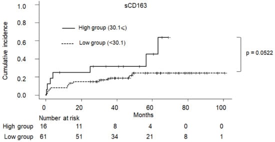| 30.1 ⩽ sCD163 | 2.870 (0.898–9.18) | 0.07530 | 3.410 (0.9310–12.50) | 0.0640 |