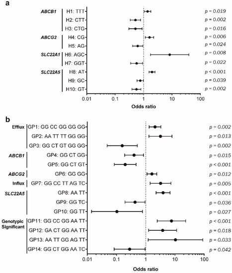 Haplotypes (H) and genotypic profiles (GP) significantly correlated with CML development; (a) the haplotypes and (b) the GPs positively correlated with CML susceptibility. The respective p value is shown for each analysis. Haplotype groups: ABCB1: rs1045642/rs1128503/rs2032582; ABCG2: rs2231142/rs2231137; SLC22A1: rs628031/rs683369/rs1867351; SLC22A5: rs274558/rs2631365. Genotypic profile categories: Efflux (ABCB1: rs1045642/rs1128503/rs2032582/ABCG2: rs2231142/rs2231137); Influx (SLC22A1: rs628031/rs683369/rs1867351/SLC22A5: rs274558/rs2631365); ABCB1: rs1045642/rs1128503/rs2032582; ABCG2: rs2231142/rs2231137; SLC22A5: rs274558/rs2631365; Genotypic Significant (ABCB1: rs1045642/rs1128503/ABCG2: rs2231142/SLC22A5: rs274558/rs2631365).