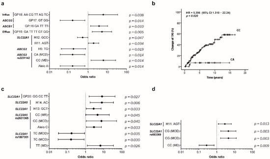 In our cohort, CML patients carrying the A allele of ABCG2 rs2231142 had lower probability of developing TKI resistance, according to allele, genotype, haplotype (H5), and genotypic (GP17) profile frequencies, and their associated OR values (Figure 2a). In addition, a protective effect (OR = 0.456, 95%CI 0.243–0.856, p = 0.047) was also observed for the haplotype H12 (GCC) of the SLC22A1 gene (rs628031/rs683369/rs1867351). Furthermore, CML patients with the CC genotype of ABCG2 rs2231142 had a six-fold higher risk (95% CI 1.445–27.410, p < 0.014) of developing TKI resistance and five times less time before a second line of treatment (HR = 5.396, 95%CI 1.310–22.240, p = 0.020) in comparison with A-allele carriers (Figure 2b). Additionally, in the genotypic profile analysis we identified three GPs that are associated with a higher risk of resistance, GP15 of efflux (OR = 5.346, 95%CI 1.658–17.240, p = 0.005), GP16 of ABCB1 (OR = 3.769, 95%CI 1.365–10.410, p = 0.010), and GP18 of influx transporters (OR = 6.222, 95%CI 1.103–35.120, p = 0.038).