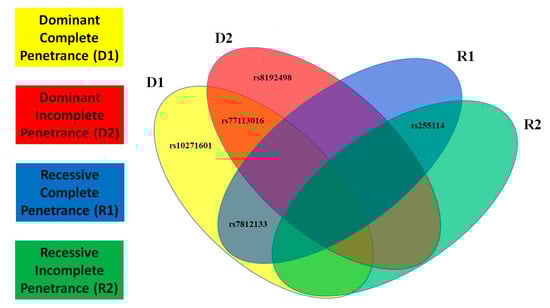 - Purcell, S.; Neale, B.; Todd-Brown, K.; Thomas, L.; Ferreira, M.A.; Bender, D.; Maller, J.; Sklar, P.; de Bakker, P.I.; Daly, M.J.; et al. PLINK: A tool set for whole-genome association and population-based linkage analyses. Am. J. Hum. Genet. 2007, 81, 559–575. [Google Scholar] [CrossRef]