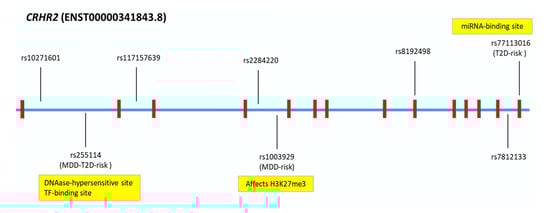 Major Depressive Disorder (MDD) and/or Type 2 Diabetes (T2D) CRHR2-Single Nucleotide Polymorphisms (SNPs) and In Silico Analysis. In silico functional predictions of CRHR2-risk variants for MDD and/or T2D.