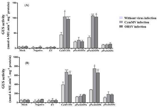 GUS fluorescent quantitative analysis of the pPaAGO5a, pPaAGO5b, and pPaAGO5c. The GUS activity in the wild-type (A) P. aphrodite subsp. formosana and (B) N. benthamiana leaves during CymMV and ORSV infection at 3 days post-inoculation (dpi). Each promoter GUS construct was assayed at least three times in four independent experiments. The GUS activity, 4-MU nmol-produced min−1 mg−1 protein, is represented as the mean ± SD of each mock (infiltration buffer only), negative and empty vector (EV; pKn), CaMV 35S, pPaAGO5a, pPaAGO5b, and pPaAGO5c. Data are mean ± SD, * p < 0.05, ** p < 0.01, *** p < 0.001 by Student’s t-test, respectively.