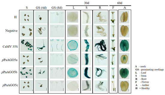 GUS histochemical staining in tissues of transgenic N. benthamiana. GUS expression driven by pPaAGO5a, pPaAGO5b, pPaAGO5c, CaMV 35S, and negative constructs. H represents healthy plants. As per the staining analysis, in CaMV 35S transgenic line, constitutive expression of GUS was observed in seeds, germinating seedlings, leaf, stem, root, flower, and anther. In the pPaAGO5a transgenic line, low expression of GUS was observed in germinating seedling, leaf, flower, and anther, moderate expression was observed in stem and root, and no expression was observed in seeds. In the pPaAGO5b transgenic line, higher expression of GUS expression was noticed in seeds, germinating seedlings, leaf, stem, root, flower, and anther. In the pPaAGO5c transgenic line, extremely low expression in germinating seedlings, leaf, and anther, low expression in the stem and root, and no expression in seeds have been observed. GUS activity was undetectable in healthy plants (H) and negative controls. The seeds, 4-and 8-day-old germinating seedlings, leaves, roots, stems of 30-day-old plants, and flowers and anthers of 60-day-old plants were incubated in GUS staining solution at 37 °C for 12 h. Scale bar of seeds: 0.1 cm; scale bar of anthers: 0.2 cm; the other scale bars: 1 cm.