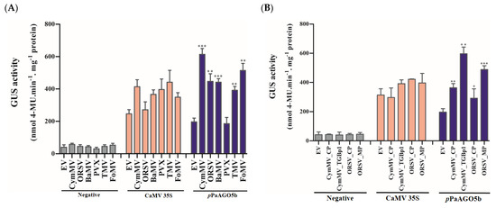GUS fluorescent quantitative activity of pPaAGO5b during virus infection and expression of viral genes. (A) GUS fluorescent quantitative analysis of the negative CaMV 35S and pPaAGO5b during CymMV, ORSV, BaMV, PVX, TMV, and FoMV infection in transgenic N. benthamiana leaves at 3 dpi. (B) GUS fluorescent quantitative analysis of the negative CaMV 35S and pPaAGO5b during CymMV_CP, CymMV_TGBp1, ORSV_CP, and ORSV_MP overexpression in transgenic N. benthamiana leaves at 3 dpi. Each promoter GUS construct was assayed at least three times in four independent experiments. The GUS activity, 4-MU nmol-produced min−1 mg−1 protein, is represented as the mean ± SD of each negative control, CaMV 35S, pPaAGO5b. Data are mean ± SD, * p < 0.05, ** p < 0.01, *** p < 0.001 by Student’s t-test, respectively.
