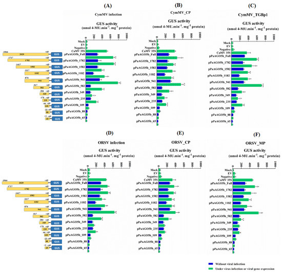 The pPaAGO5b showed significantly increased activity during viral infection and the overexpression of viral genes (Figure 3A,B). To determine which region of pPaAGO5b determines activity levels during viral infection, we functionally investigated the 5′-deletion constructs of pPaAGO5b based on cis-acting elements, which play a role during stress conditions. A total of ten 5′-truncated pPaAGO5b fragments of different sizes (−1782, −1582, −1182, −941, −582, −349, −235, −109, −88, and −65 bp upstream to TSS) were amplified from the pPaAGO5b full-length promoter. Each construct was co-infiltrated with CymMV or ORSV infectious clones or viral genes. The results of the 5′-deletion transient assay in N. benthamiana are shown in Figure 4. During CymMV infection (Figure 4A) or overexpression of CymMV_CP (Figure 4B) or CymMV_TGBp1 (Figure 4C), pPaAGO5b_941 exhibited maximal activity, followed by pPaAGO5b_full-length, pPaAGO5b_1782, pPaAGO5b_1582 as compared to those without CymMV infection or the expression of CymMV_CP or CymMV_TGBp1. During ORSV infection (Figure 4D) or overexpression of ORSV_CP (Figure 4E), ORSV_MP (Figure 4F) and pPaAGO5b_941 exhibited maximal activity, followed by pPaAGO5b_full-length, pPaAGO5b_1782, and pPaAGO5b_1582 as compared to those without ORSV infection or ORSV_CP or ORSV_MP. The 5′-deletion constructs pPaAGO5b_582, pPaAGO5b_349, pPaAGO5b_109, pPaAGO5b_88, and pPaAGO5b_65 (UTR alone) exhibited relatively poor activity compared with the remaining 5′-deletion constructs (Figure 4A–F). GUS activity levels were not detected in mock, EV, or negative control treatments.